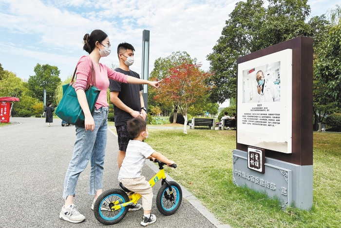 9月26日,武漢東湖綠道楚風園,市民在“荊楚楷模”張定宇事跡展板前駐足觀看。(湖北日報全媒記者 李溪 攝)