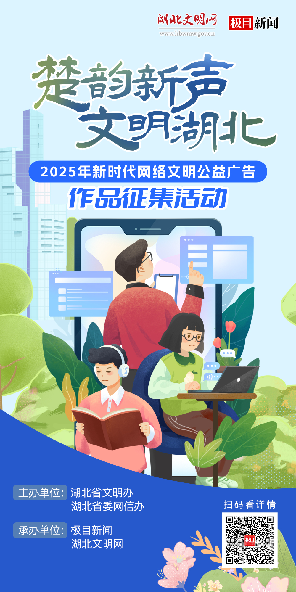 為進(jìn)一步加強(qiáng)網(wǎng)絡(luò)文明建設(shè),發(fā)揮好公益廣告弘揚(yáng)主流價(jià)值、傳播文明理念、傳承優(yōu)秀文化、引領(lǐng)時(shí)代新風(fēng)的積極作用,展現(xiàn)湖北特色文化與時(shí)代風(fēng)貌,由湖北省文明辦、湖北省委網(wǎng)信辦主辦,極目新聞、湖北文明網(wǎng)承辦的2025年湖北“新時(shí)代網(wǎng)絡(luò)文明公益廣告”作品征集活動(dòng)正式啟動(dòng)。