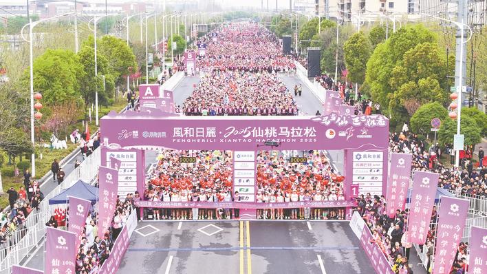 2025仙桃馬拉松在新城大道鳴槍起跑,來自中國、肯尼亞、加拿大等3個國家的15000名選手用腳步丈量大美仙桃。(吳晴霄 攝)