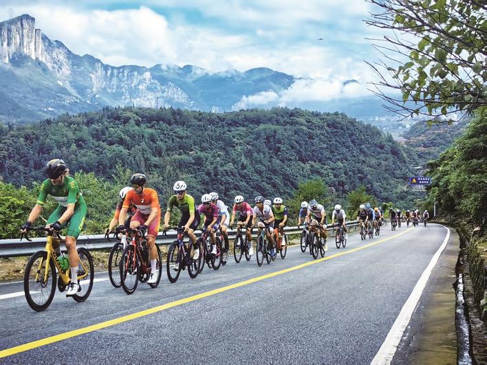 參加2025中國公路自行車公開賽的選手穿越恩施大峽谷—騰龍洞世界地質公園。 (張瓏瀚 攝)
