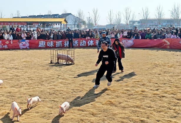 為增強(qiáng)參與感與體驗(yàn)感,年貨節(jié)還精心策劃了豐富互動(dòng)環(huán)節(jié)。抓豬(如圖)、抓雞、套大鵝、拔河比賽等充滿(mǎn)鄉(xiāng)土趣味的游戲吸引了眾多游客參與;在非遺體驗(yàn)區(qū),寫(xiě)春聯(lián)、做糖畫(huà)等活動(dòng)讓傳統(tǒng)技藝煥發(fā)新生;美食制作區(qū)內(nèi),游客親手包餃子、搓湯圓、灌香腸,在勞動(dòng)中感受濃濃年味。此外,全天輪番上演的歌舞及樂(lè)隊(duì)表演,持續(xù)點(diǎn)燃現(xiàn)場(chǎng)氣氛,打造出沉浸式年節(jié)體驗(yàn)場(chǎng)景。